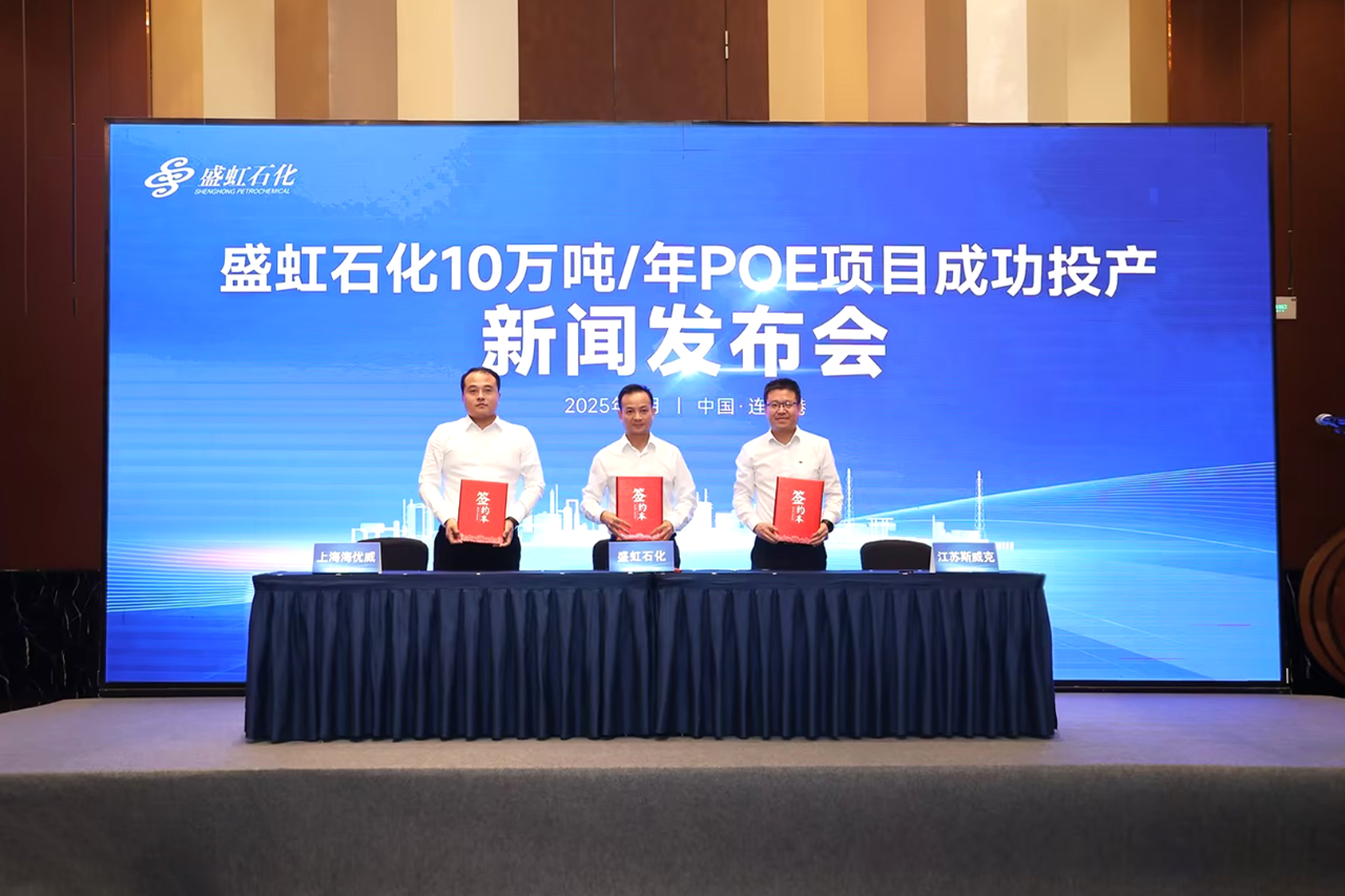 9月4日,盛虹石化10萬(wàn)噸/年P(guān)OE項(xiàng)目成功投產(chǎn)新聞發(fā)布會(huì)暨長(zhǎng)期供貨戰(zhàn)略合作簽約儀式在江蘇連云港舉行,首批320噸優(yōu)等產(chǎn)品同步發(fā)車交付。
