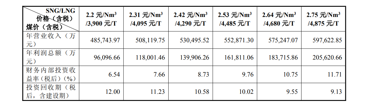 項(xiàng)目經(jīng)濟(jì)效益評價:按照項(xiàng)目建設(shè)期3年,第4年投產(chǎn)且生產(chǎn)負(fù)荷達(dá)到80%,第5年達(dá)產(chǎn);項(xiàng)目經(jīng)濟(jì)服務(wù)年限為15年,所得稅率25%,年生產(chǎn)121428萬Nm³合成天然氣(SNG)、58.2672萬噸液化天然氣(LNG),按照煤價150元/噸—160元/噸(含稅,燃料煤150元/噸、原料煤160元/噸)測算,在不同的SNG/LNG銷售價格時,募投項(xiàng)目的財務(wù)內(nèi)部投資收益率(稅后)為6.54%—11.71%,投資回收期(稅后,含建設(shè)期)為9.13年—12年。